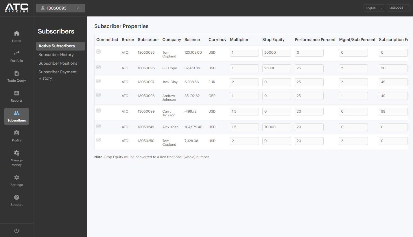 Client Portal The account holder has access to the back office to view the subscription settings, level of participation, equity stop level, and the fees associated with the account. The account holder can also monitor the trading activity, pull report summaries, request to withdraw funds, submit a ticket inquiry and much more.